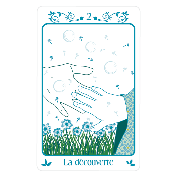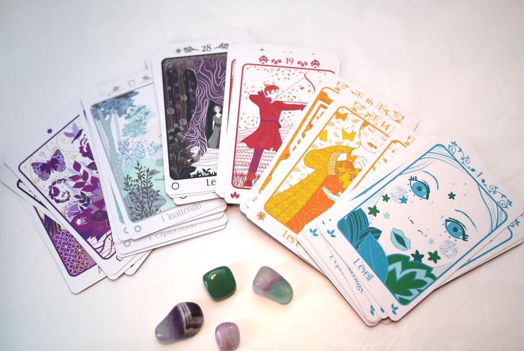 Il composé de 50 cartes s'inspirant des archétypes féminins et masculins aux 5 âges de la vie et des étapes clefs de la numérologie. Tu trouveras ainsi 9 cartes pour chaque âge : l'enfance (bleues), la jeunesse (jaunes), la fleur de l'âge (rouges), la maturité (noires), la sagesse (argentées), plus 5 cartes « étoiles » (violettes).